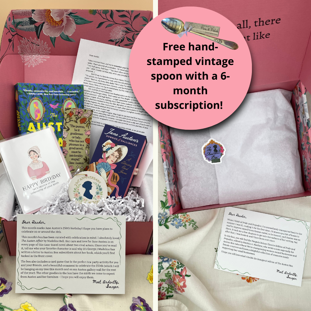 With The Austen Box, I’ve carefully curated beautiful editions of Austen’s novels, along with my favorite Austen retellings, and paired them with delightful Austen-themed gifts and ephemera. Is this all just a ploy for me to add even more to my Austen collection? Maybe, but at least now I’m doing it with friends.
